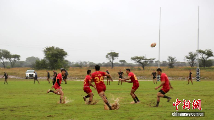 当地时间3月15日,中国七人制男子橄榄球队在南非林波波省莫迪莫勒与多只当地球队进行交流赛。图为中国队球员在场上奋力拼搏。中新社记者 孙翔 摄